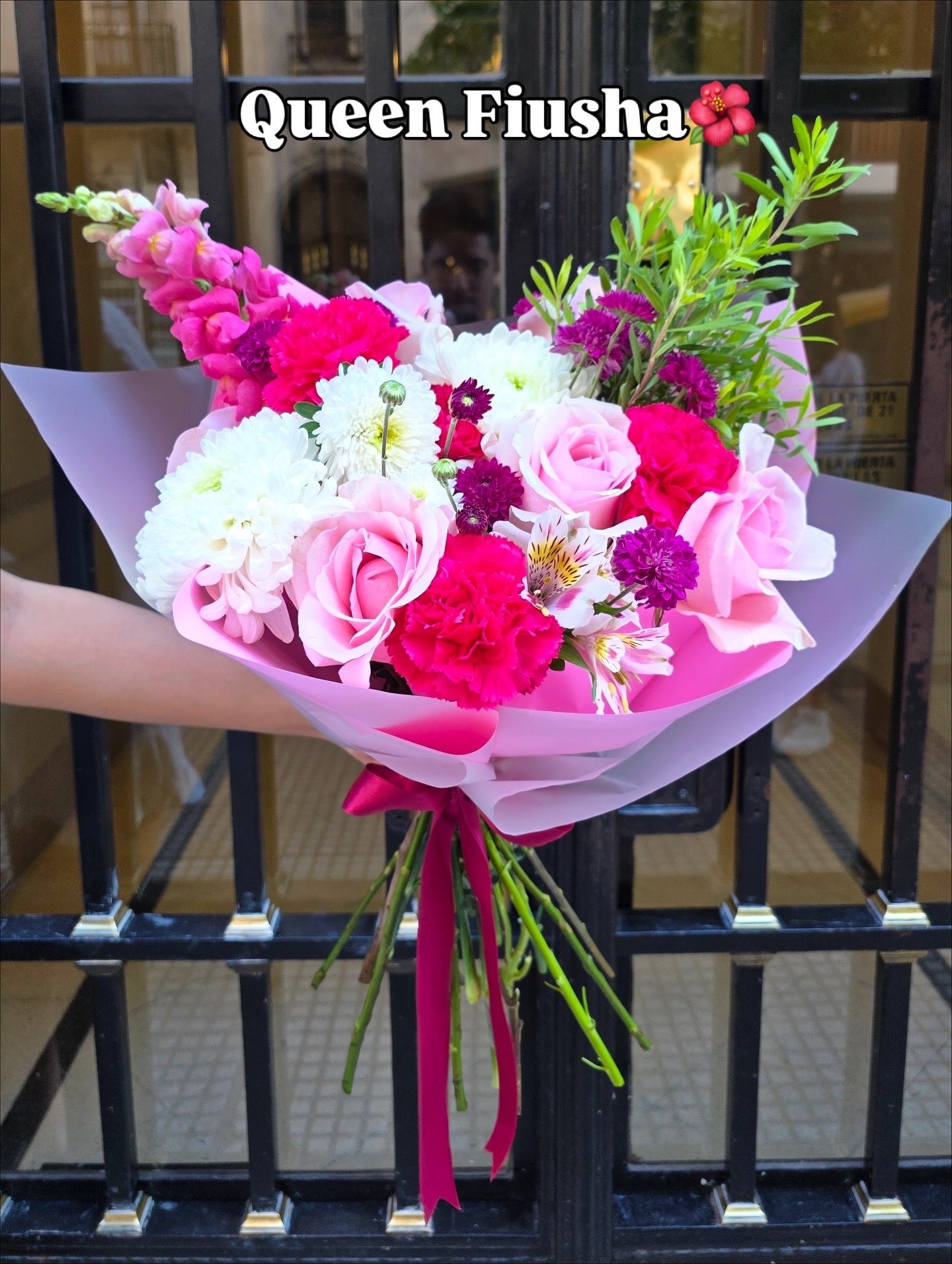 Bouquet de 6 rosas rosadas importadas más flores de estación, envuelto en papel coreano.